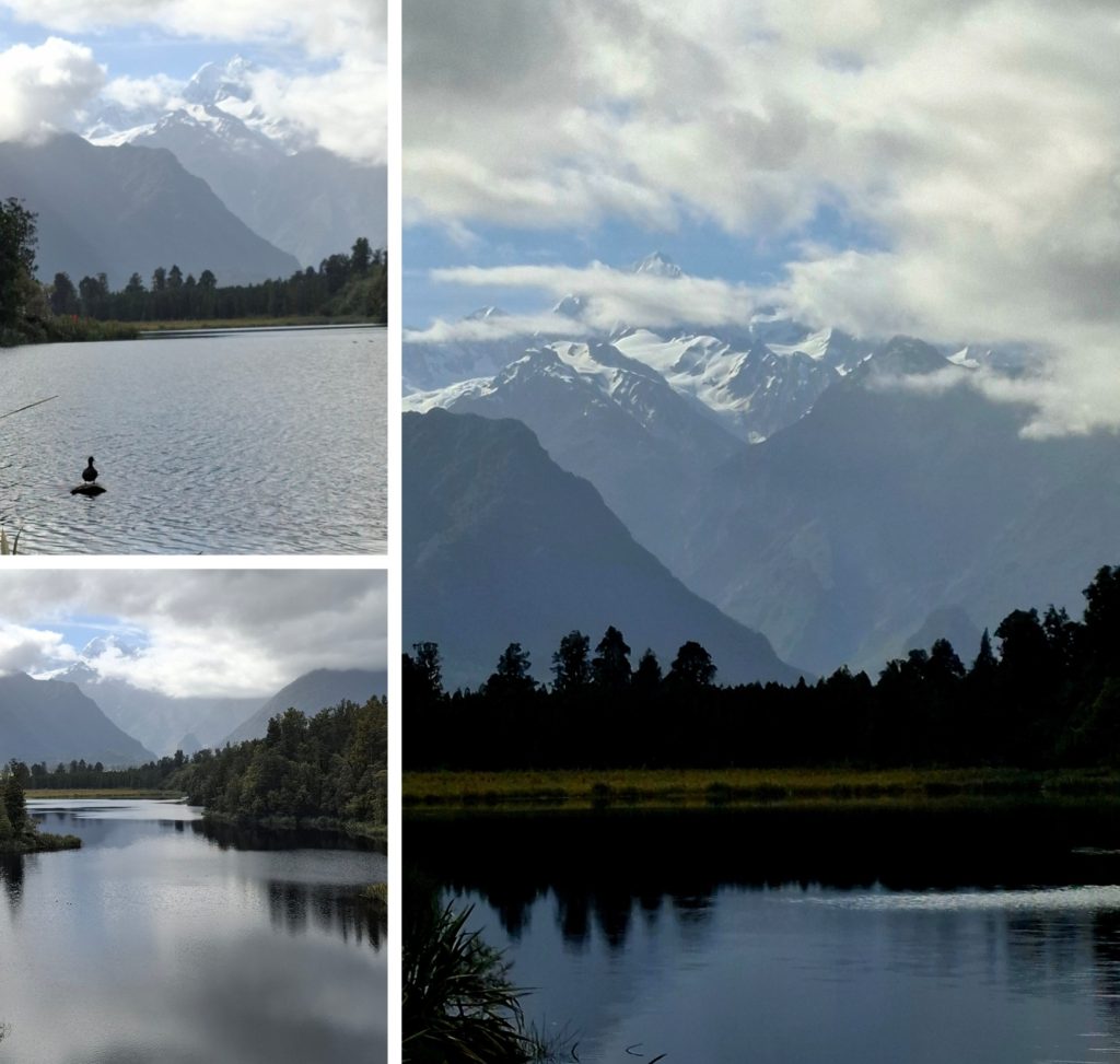 The next morning we both got up at 5.20 a.m. to cycle with the free shabby bikes to Lake Matherson. We parked our bikes at the cafe and walked first to Lake Gault. It was chilly but beautiful already. We went for a brisk walk and once at the lake it was stunning! The reflection of both Mt. Tasman and Mt Cook were easily to be spotted in the lake. Due to the clouds it wasn’t as spectacular as on some intragram photos… but being there was incredible.