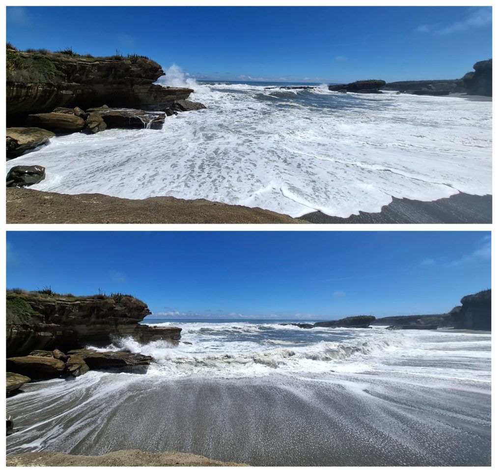 As tide was rising, it seemed the perfect time to visit the Pancake rocks. Following the path next to the main road, passing the Punakaiki Cavern, a cave where you can spot Glowworms, I eventually reached a couple of buildings just in front of the Panakaiki Rocks. Two restaurants, a souvenir shop, an ice cream place and a Visitors’ information centre. And of course lots and lots of caravans and cars.